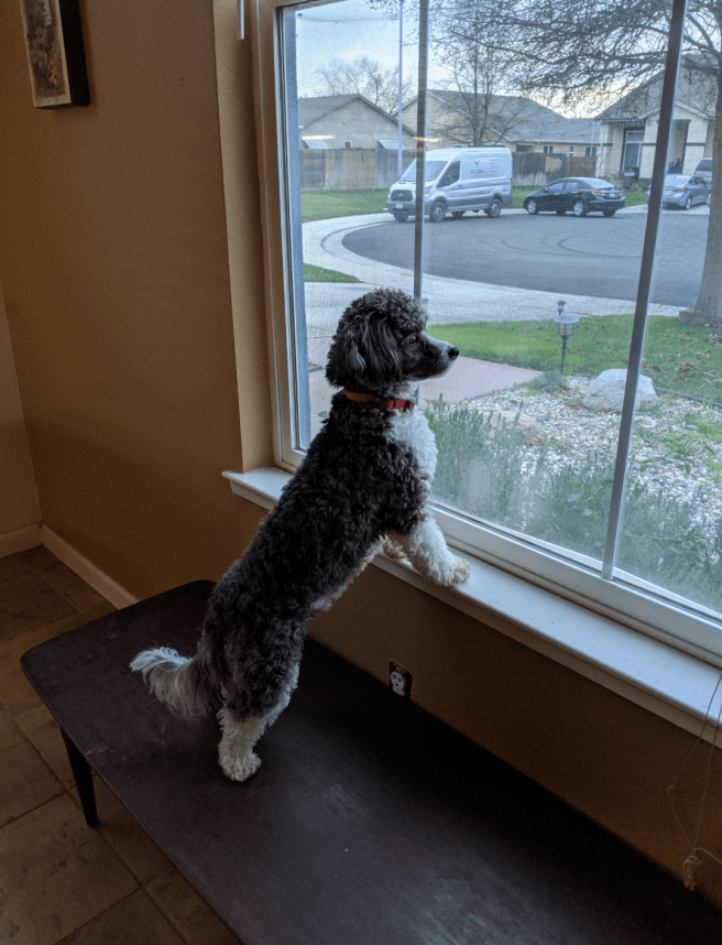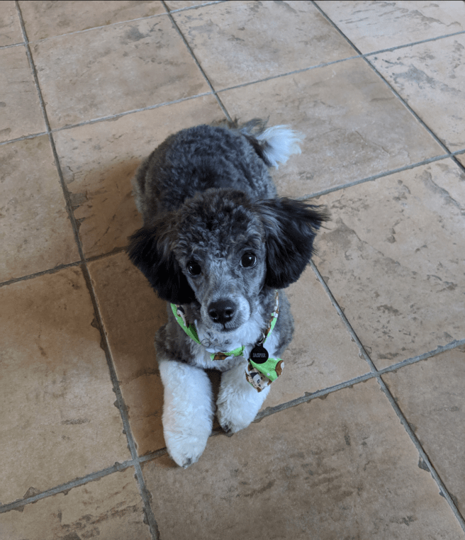 One day, I was out walking Brenna, and a neighbor stopped me and asked if I knew anyone who wanted a puppy. I tried to hide my excitement, and asked if I could see them. He had them in a puppy play yard in his garage. He said they were miniature poodle puppies. I told him I’d think about it. And so I did. Lots of thinking, and wheedling to William, lol. A few weeks later, I brought Jasper home.