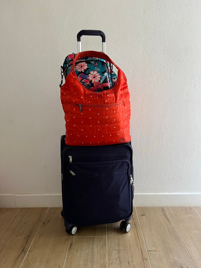 We only brought carry-on luggage! I took my eBags Piazza carry-on suitcase (now discontinued), and my Lug Gondola tote as my personal item bag. The Lug tote has a strap to slip onto my suitcase handles, so it was easy to maneuver around the airport with these.